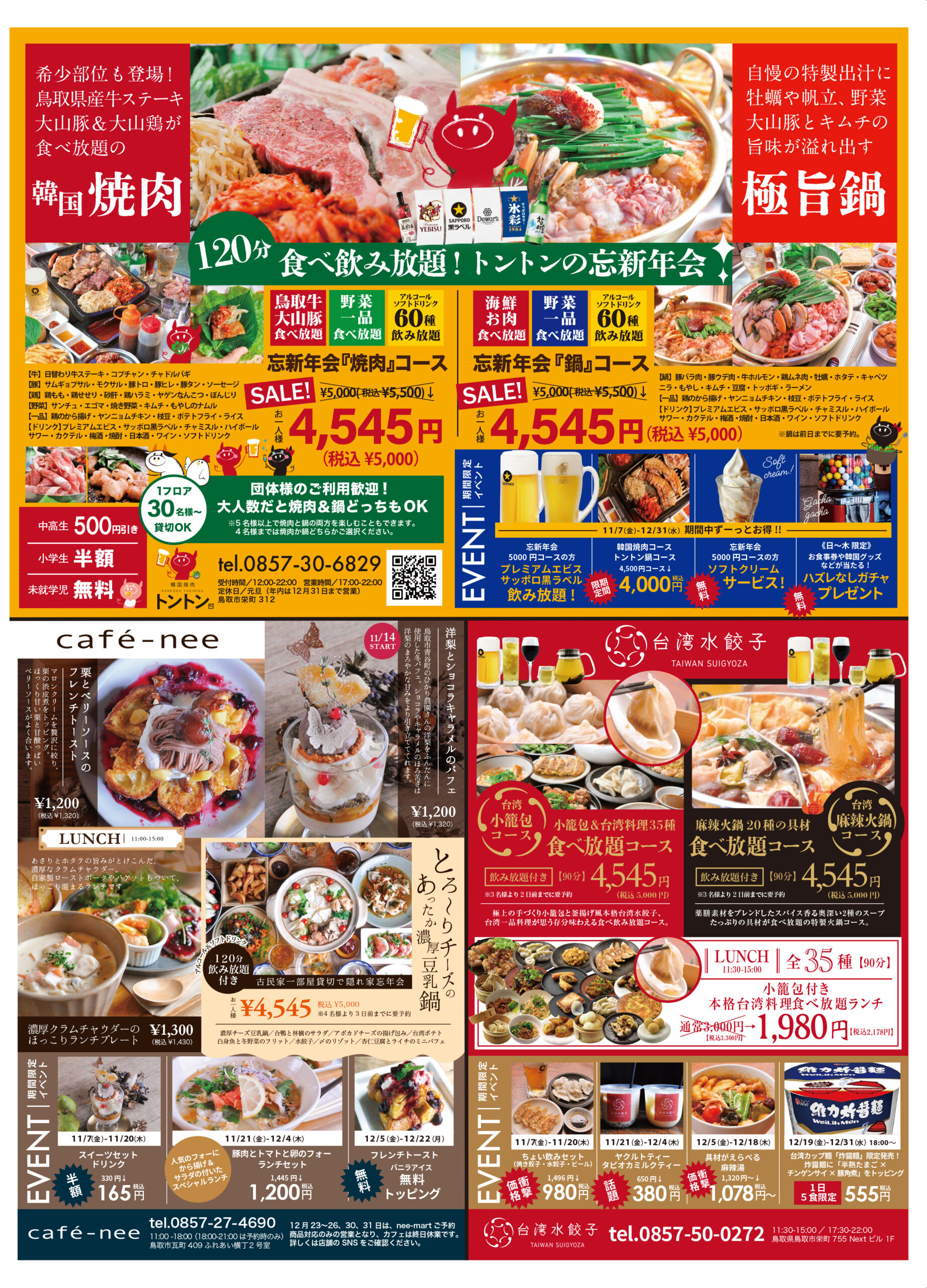 忘新年会プランも4店舗ありますのでお好みのプランをお選びいただけます。たくさんのご予約をお待ちしております。